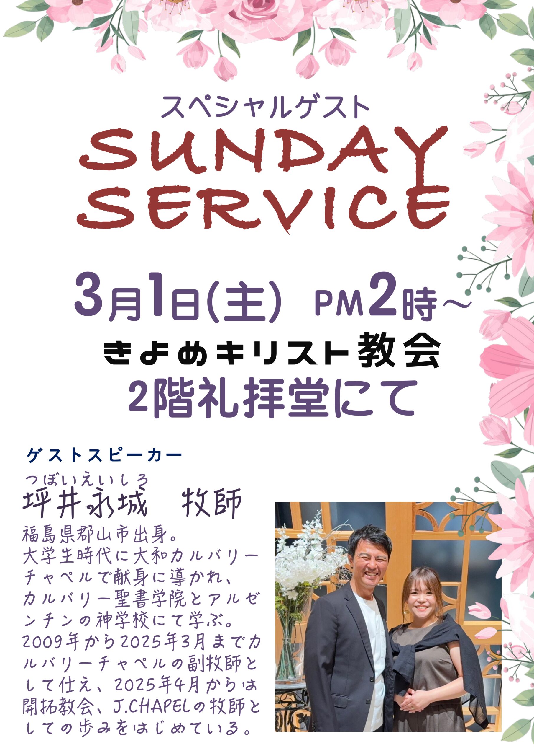 ハレルヤ!3月1日の主日礼拝には、坪井永城(つぼい えいしろ)牧師を